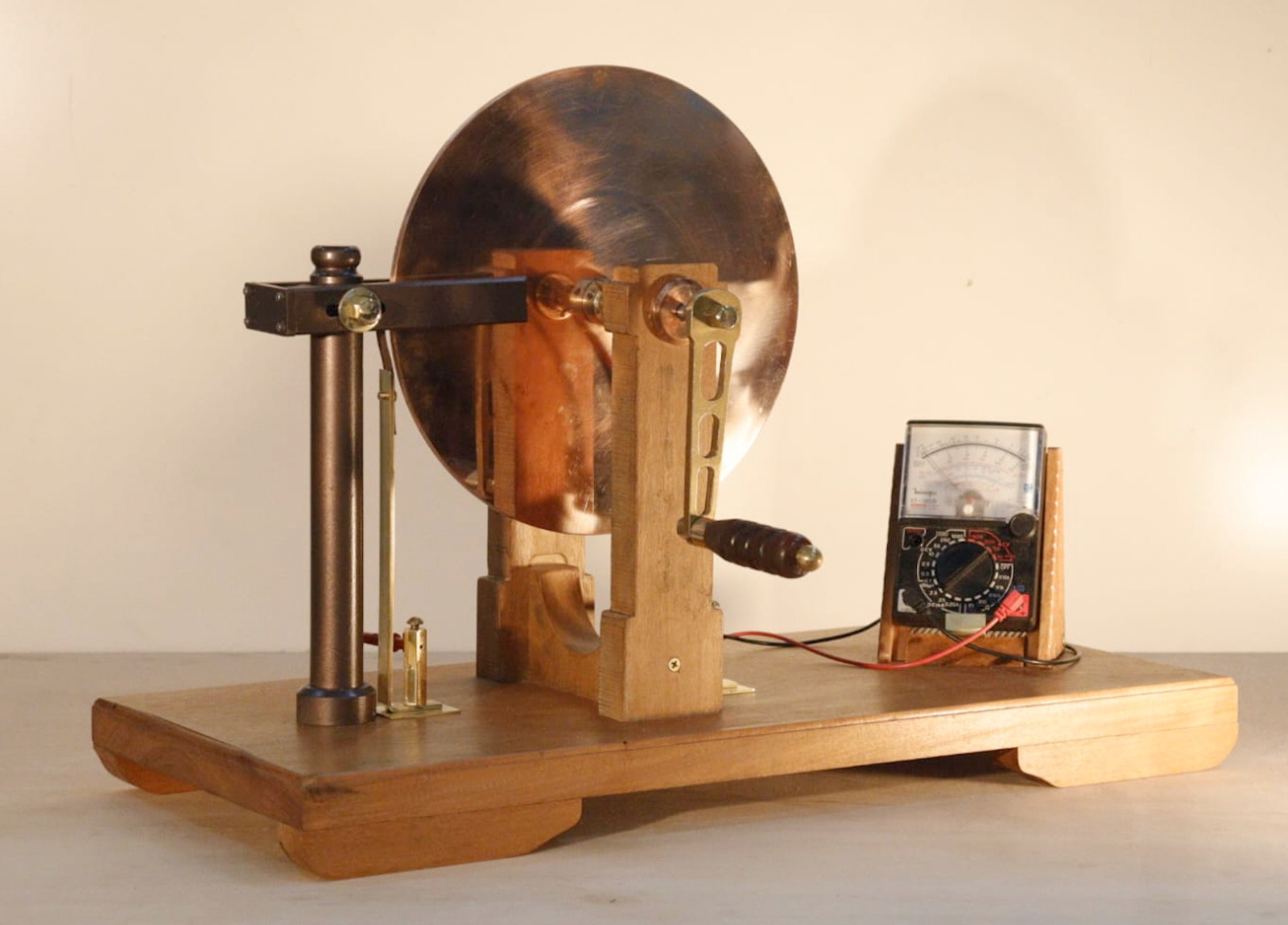 A compreensão do Disco de Arago levou Faraday à construção do primeiro dínamo da história: o Dínamo de Disco, de Faraday. Mantendo um disco de cobre em rotação na presença de um corpo magnético, Faraday coletou a corrente induzida em diversas possíveis configurações do sistema [1]. Escolhendo diversos pares de pontos de contato do disco com um circuito externo, estabeleceu que uma situação favorável ocorre ao conectar-se ao eixo de rotação uma das extremidades do circuito, e a outra à borda do disco. Faraday concretizou assim seu intuito, perseguido desde a descoberta do eletromagnetismo, em 1820, de produzir eletricidade a partir do magnetismo. [2]